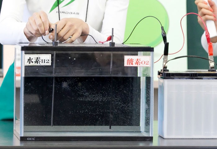 水槽の電極に電気を流し、水が水素と酸素に分解される様子を観察します。水の構成要素や、電気分解のメカニズムを、わかりやすく説明します。