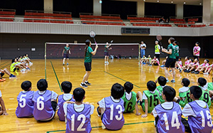 当日は小学生4~6年生計49名の参加者に対して、全体でのウォーミングアップ後、選手によるデモンストレーションでショットの紹介を行いました。その際にスマッシュの速さを体験してもらうコーナーでは、シャトルのスピードに驚く声がたくさん聞こえてきました。