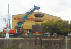3幅が比較的狭い河川は推進工法で横断。クレーンで吊っている掘削用刃先で直径3m深さ13.5mの円筒形の立坑を両岸に掘削する。