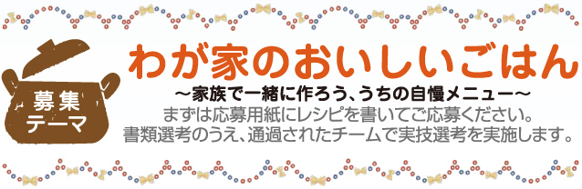 家族みんなでお料理すると、楽しい会話が弾みます。家族みんなで食べると、テーブルはおいしい笑顔に包まれます。そんな、コミュニケーションが広がる、わが家の“自慢のメニュー”を教えてください。たくさんのチャレンジお待ちしています。まずはレシピをエントリーすればOK!書類選考のうえ、通過チームにて実技選考を行います。