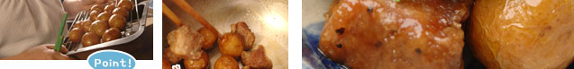 新じゃがはかためにゆで、油で揚げる。適当な大きさに切った肉は、塩こしょうして片栗粉をまぶし、油で揚げる。