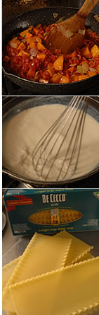 耐熱皿にホワイトソースを少し敷き、(1)、野菜ソース、ホワイトソースと重ねていく。最後はホワイトソースできちんとふたをして、パルメザンチーズをかける。オーブンでチーズが溶けるまで焼けばできあがり。 |