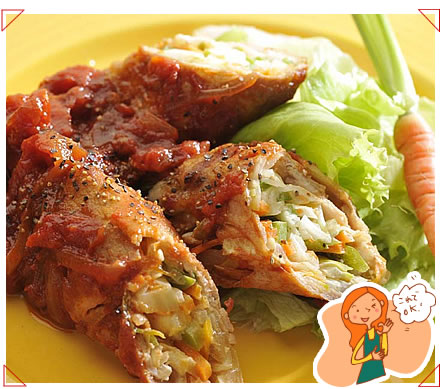 (3)が焼きあがったら、余分な油をキッチンペーパーでふきとり、トマトソースを和えて召し上がれ! |