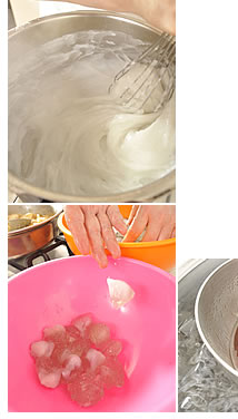 全ての材料を混ぜ合わせ、一度沸騰させた後、凍らせる。 ※アイスクリームのようにやわらかくするには、冷やす途中で1度泡立てる。氷のようにするには、アイスキューブにそのまま流し込む。