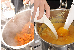 (2)に、水と牛乳を加え、鍋肌の焦げをこそげ落とす。滑らかになるまでミ キサーにかける。塩とこしょうで味を調える。