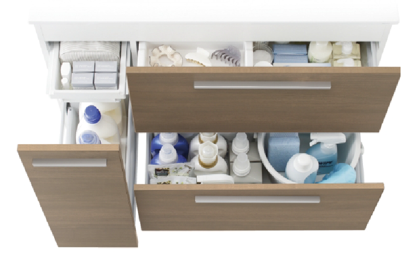 たっぷり納収したい引き出し収納は開けるだけで中身が見えて、取り出しやすさは抜群です。鏡裏の収納には化粧品や小物類をすっきり整理でき、洗面台まわりがいつもキレイに保てます。使いやすさと美しさを両立した快適な洗面空間です。