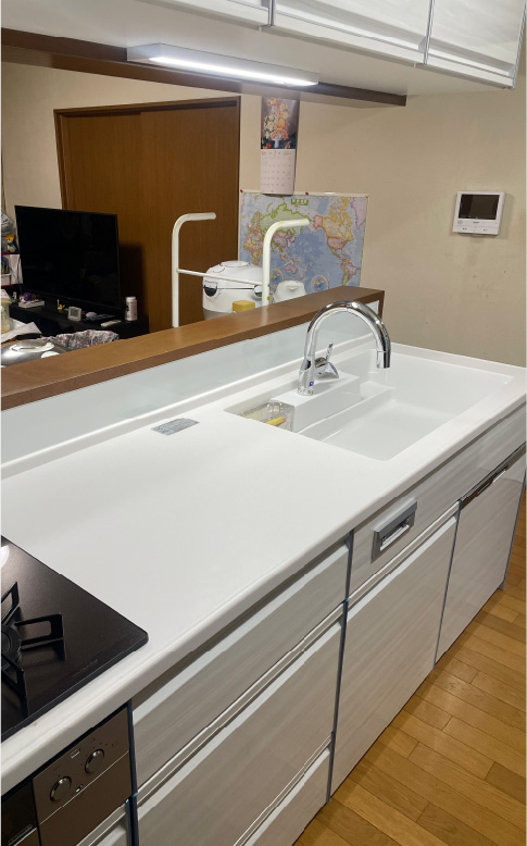 以前にユニットバスのリフォームをお願いしており、対応が良かったので今回も安心して依頼できました。キッチンはタカラスタンダード製を選び、デザインや質感も気に入っています。明るい色にしたことで、台所全体が明るくなり、気持ちよく使える空間になりました。