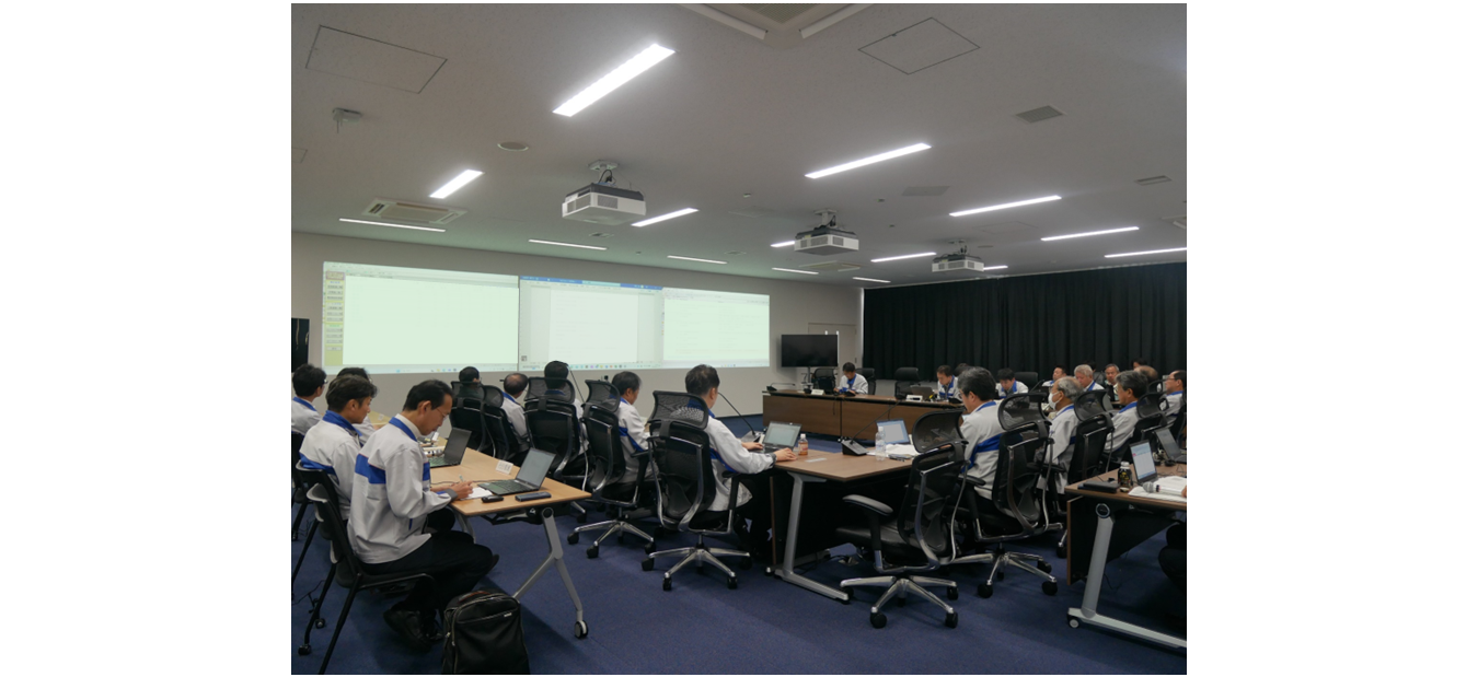 グループ会社7社を含めた安否確認訓練などに加え、災害対策本部会議訓練では、防災センタービルに設置された災害対策本部を中心に、各班からの被害状況報告、緊急供給停止判断など大規模地震時における初動対応から復旧計画立案に至る流れを確認しました。